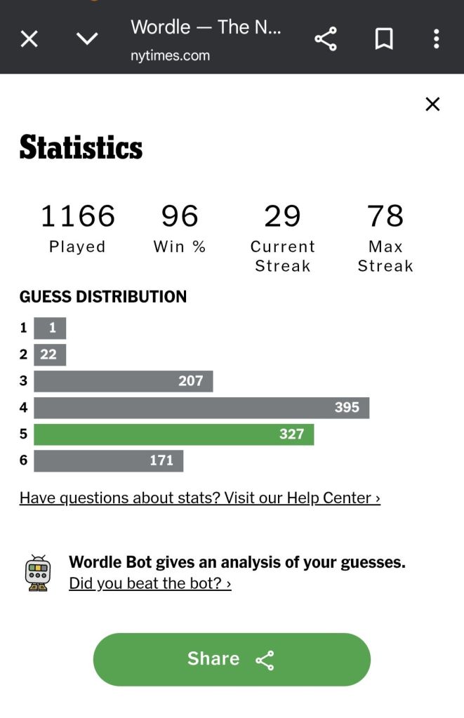 Life has gotten in the way a few times, and I’ve forgotten to play, and that stuffs up my my streak, or sometimes I screw the answer up.